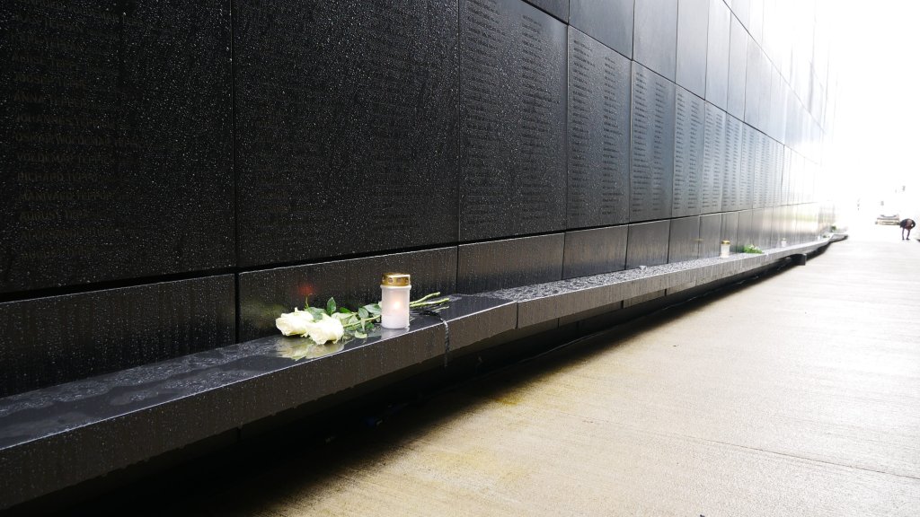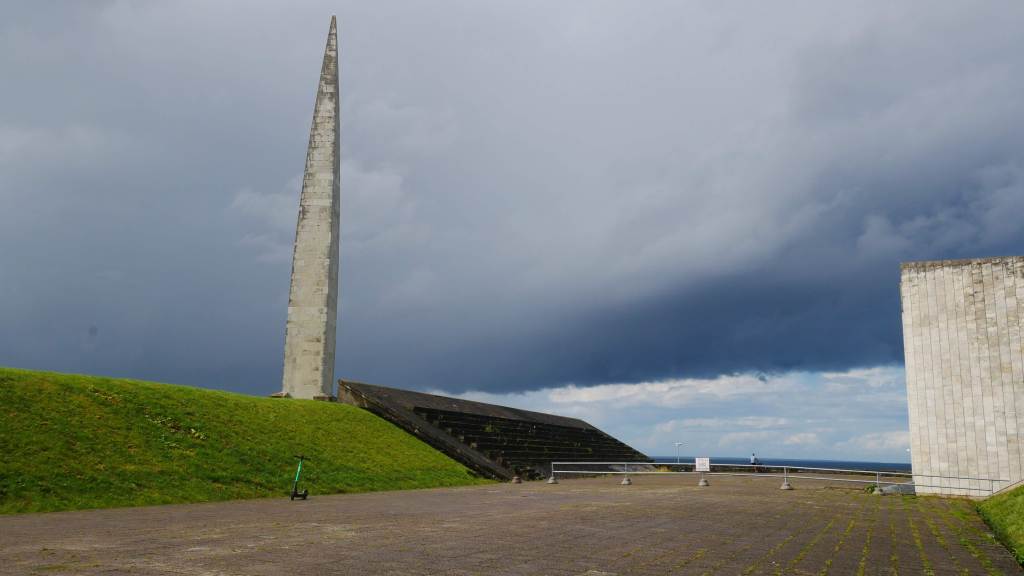 Jatkuvat sadekuurot häiritsivät myös muistomerkkisarjan, Maarjamäe Memorialin, tarkastelua. Kastuimme jo pyöräillessämme ja sateen jatkuessa suojauduimme bussipysäkin katokseen. Kun kuuro hellitti, kävimme katsastamassa muistomerkit pikaisesti ja sateen alkaessa taas pisaroida kiirehdimme jälleen pyöriä noutamaan ja jatkamaan matkaa. Muistomerkkikokonaisuus oli mielenkiintoinen eri historian kerroksineen ja olisin mielelläni tutustunut siihen vielä tarkemmin. Maarjamäen linnan päätimme lopulta jättää kokonaan välistä ja jatkaa matkaa kuivattelemaan vaatteita oluen ääreen.