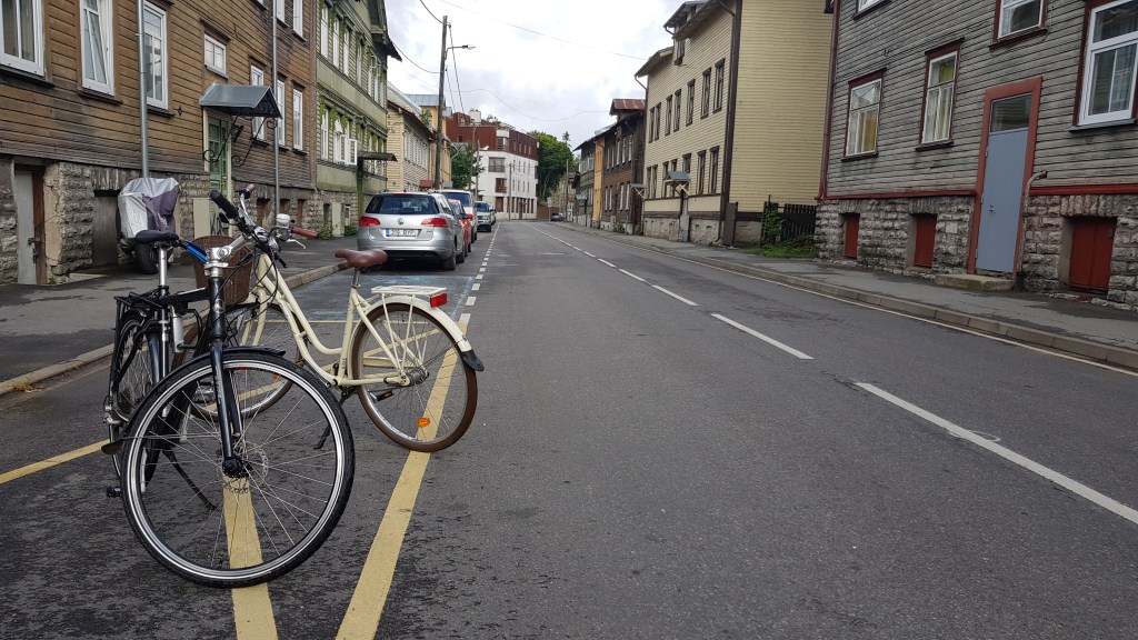 Saavuimme Tallinnaan illalla puoli kahdeksan aikaan ja mielestäni laiva kaarteli ja keinui huomattavan paljon parkkeerausvaiheessa, jolloin odottelimme autokannella pyörinemme. Ehkä se joutui taskuparkkeeraamaan käsijarrun avulla. Kun pääsimme ulos, satoi kaatamalla. Siis aivan kaatamalla. Matkakumppanin kengät olivat parin kilometrin pyöräilymatkan jäljiltä märät vielä maanantaina.