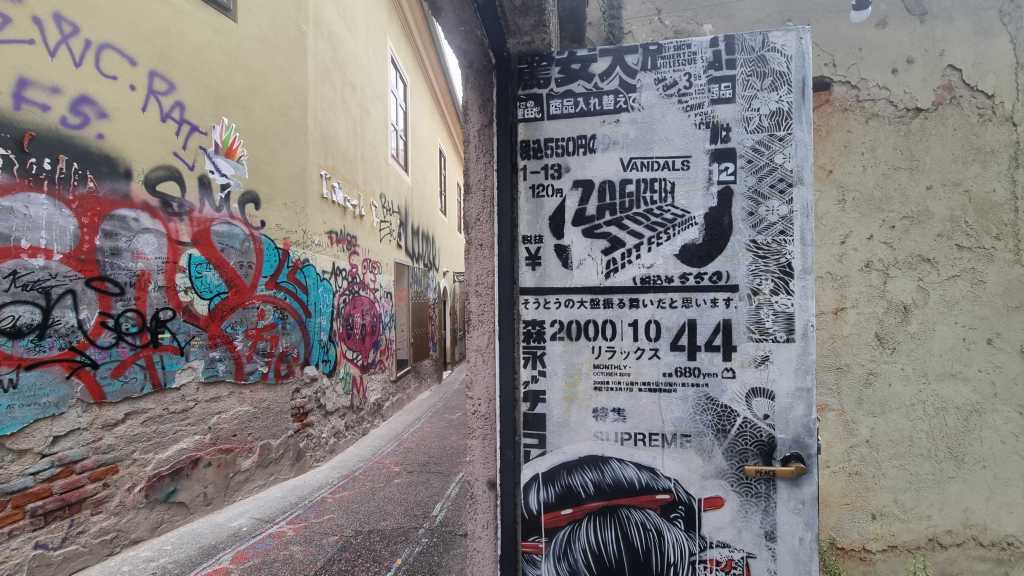 Lähetin nytkin tälle oppaallemme viestiä ja ehdotin, että kävisimme kahvilla tai oluella — hän vastasi olevansa vankilassa! Ajattelin heti, että hän on jäänyt kiinni laittoman graffitin maalaamisesta, mutta seuraava viesti selvensi: hän oli pitämässä vangeille taidetyöpajaa. Näiden kiireidensä vuoksi hän ei ehtinyt meitä tavata, mutta kertoi sen sijaan järjestämästään katutaidefestivaalista, jonka jäliltä löysimme teoksia Zagrebin kaduilta.