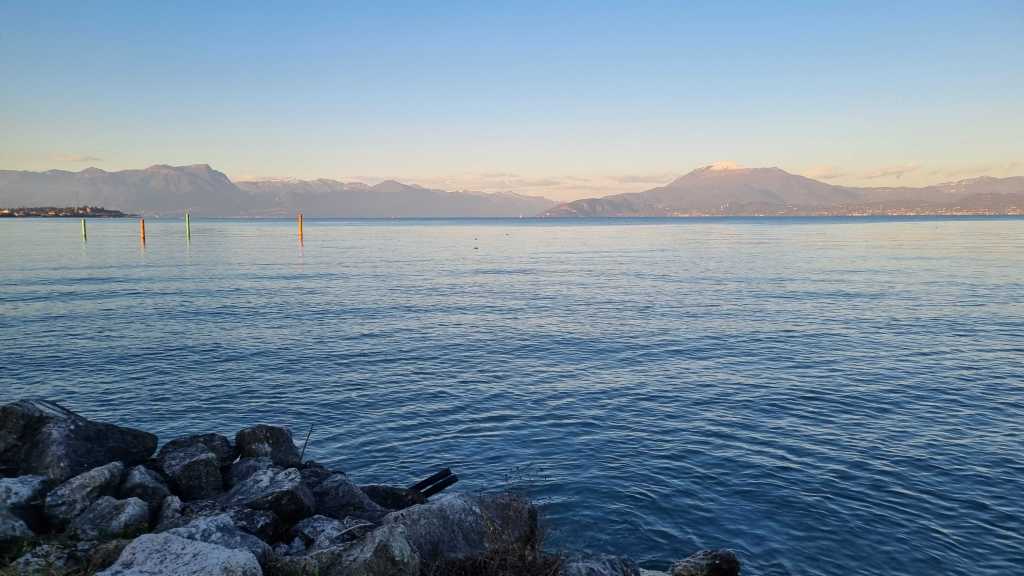 Niinpä puolitimme matkan Kroatiasta Ranskaan viipymällä yhden yön Garda-järvellä pienessä aamiaismajoituksessa. Saavuimme illalla vähän ennen auringonlaskua: juuri sopivasti, ettei majoitusliikettä ja parkkipaikkaa tarvinnut etsiä pimeässä. Tämä on meillä yleensä tavoitteena, kun mietimme siirtymien ajankohtia. Miksi etsiä uutta paikkaa pimeässä, kun se on ihan riittävän hankalaa usein valoisassakin?