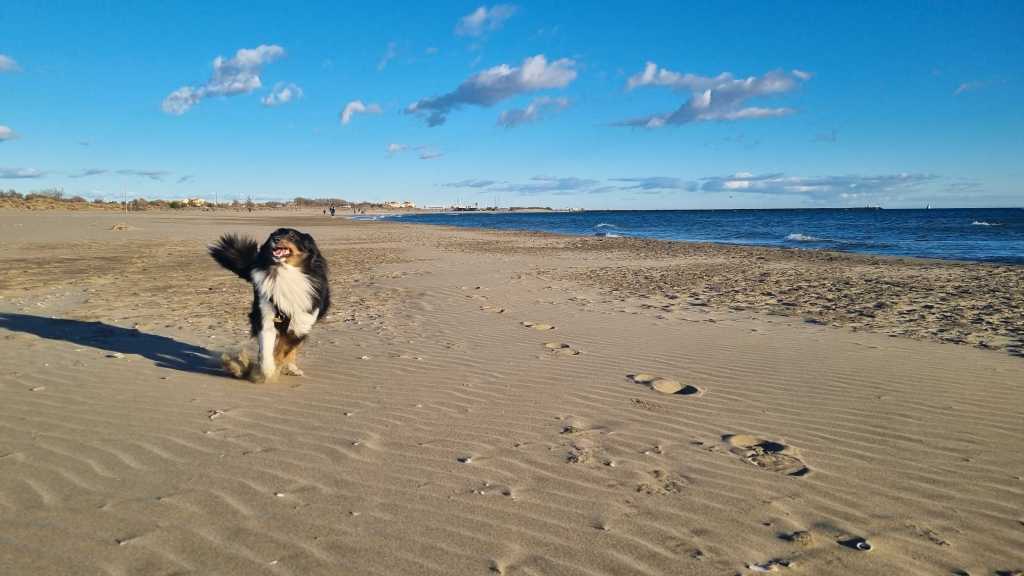 Agde koostui pienestä keskustasta ja sen ympärille levittäytyvistä hotelli- ja loma-asuntoalueista. Me olimme vuokranneet pienen studion läheltä rantaa. Tämä oli sesongin ulkopuolella erittäin edullista ja tuntui, että meillä oli lähestulkoon koko Agde omassa käytössämme. Paikassa oli erikoinen tunnelma: korkeissa tornitaloissa asui vain kourallinen väkeä nyt marraskuun lopulla, valtava hiekkaranta oli lähes tyhjillään muutamia lenkkeilijöitä ja koiran ulkoiluttajia lukuun ottamatta. Minä ja Mango otimme tästä kaiken irti: lenkkeilimme hiekalla aamuisin, keskellä päivää ja vielä viimeisenä illalla.