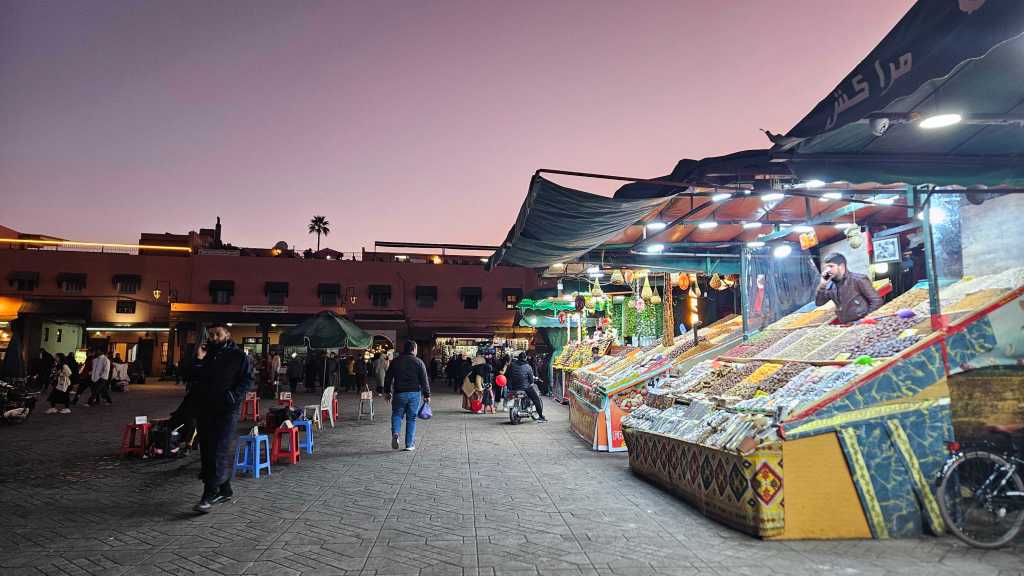 Marrakeshissa, kun palailee hotellille illalliselta kannattaa jäädä tarkastamaan, millainen meno on suurella aukiolla. Tänne nimittäin kerääntyy illan pimentyessä katuartisteja, jotka soittavat perinteistä berberimusiikkia. Paikalliset ja turistit kerääntyvät piireihin maahan levitettyillä matoille istuen esiintyvien muusikoiden ympärille. Muusikkoryhmät ovat lähellä toisiaan aukion yhdellä laidalla ja heitä on kymmeniä. Koko aukio tuntuu täyttyvän rummutuksen, peltikastanjettien ja perinteisten puhallin- ja jousisoitinten synnyttämästä rytmikkäästä kakofoniasta.