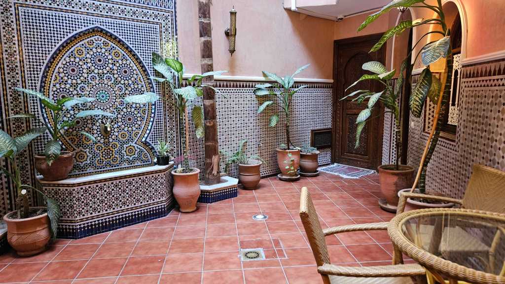 Marrakeshin vanhan kaupungin sokkeloisilla kujilla kulkiessamme huomasimme pian, ettei medinassa tosiaan muunlaisia hotelleja tainnut ollakaan kuin riadeja. Siksi alkuperäinen ajatukseni Best Western -tyyppisestä majapaikasta alkoi heti medinaan saavuttuamme tuntua absurdilta. Pienten kiemurtelevien kujien varrella jokaisesta avoimesta oviaukosta pilkisti pieni puutarha ja sen ympärillä huoneiden ovia ja ikkunoita. Jotkut olivat yksinkertaisia ja koruttomia, toisista oviaukoista taas näki nopean vilauksen runsaasta puutarhasta, koristeellisista huoneiden ikkunoista ja tyylikkäästi pukeutuneesta henkilökunnasta. Kadulle päin jokainen riad näytti samalta, mutta sisältä saattoi löytyä joko vaatimaton hostelli tai viiden tähden hotelli, spa ja ravintola.
